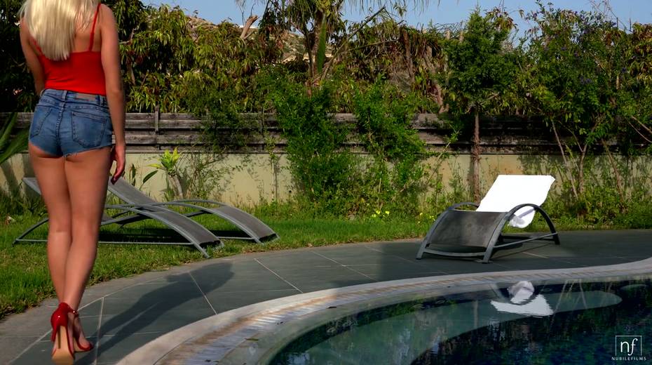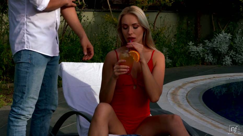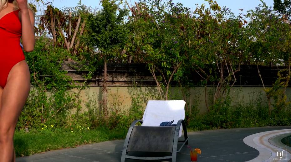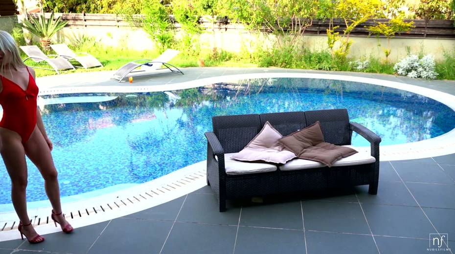 Glamorous blonde in red bikini Angelika Grays is making love by the poolside