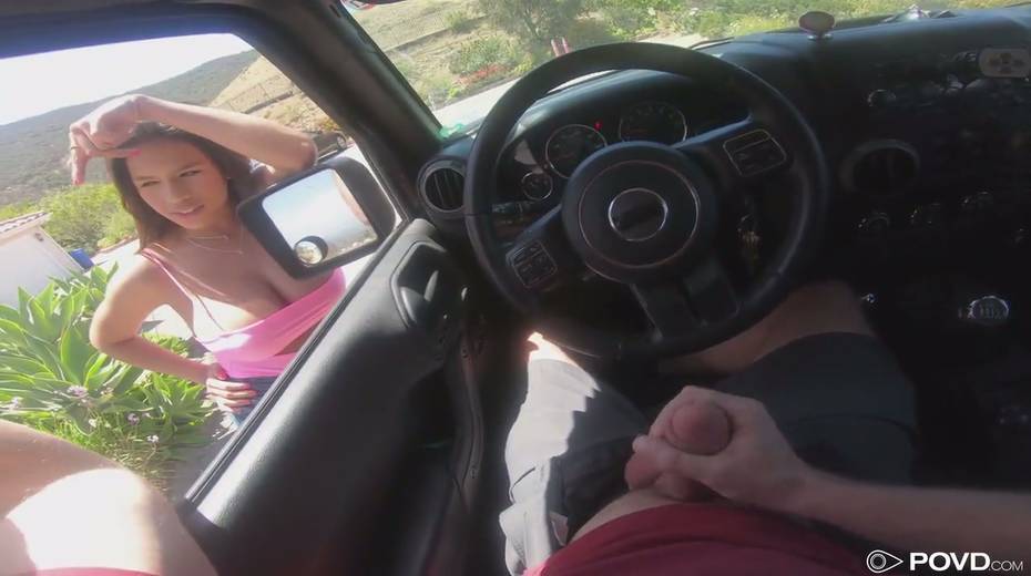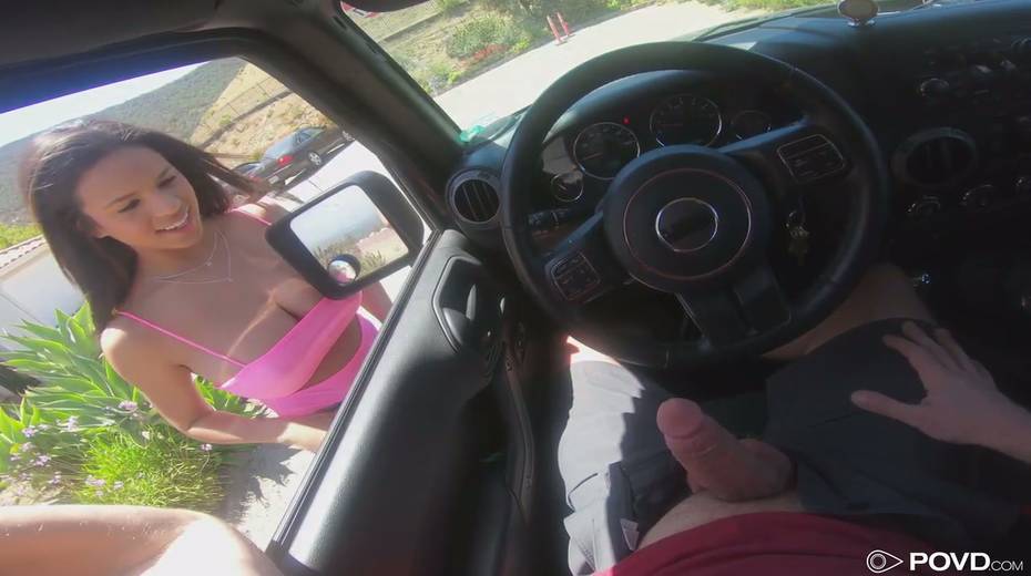 Hypnotizing busty hitchhiker Autumn Falls gives a blowjob in the car and gets her muff nailed indoor