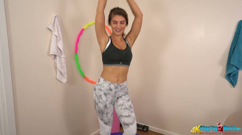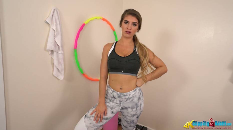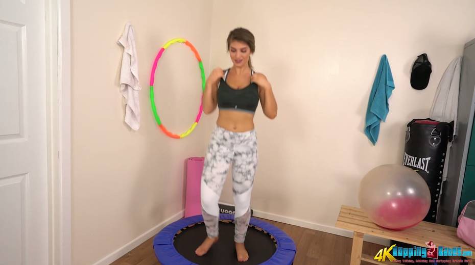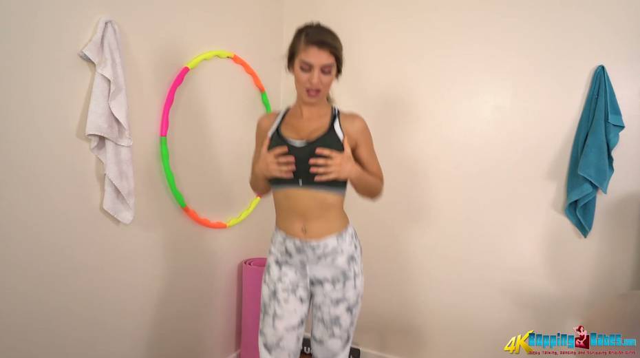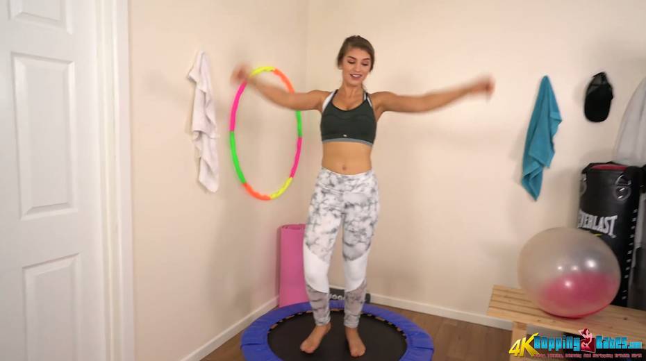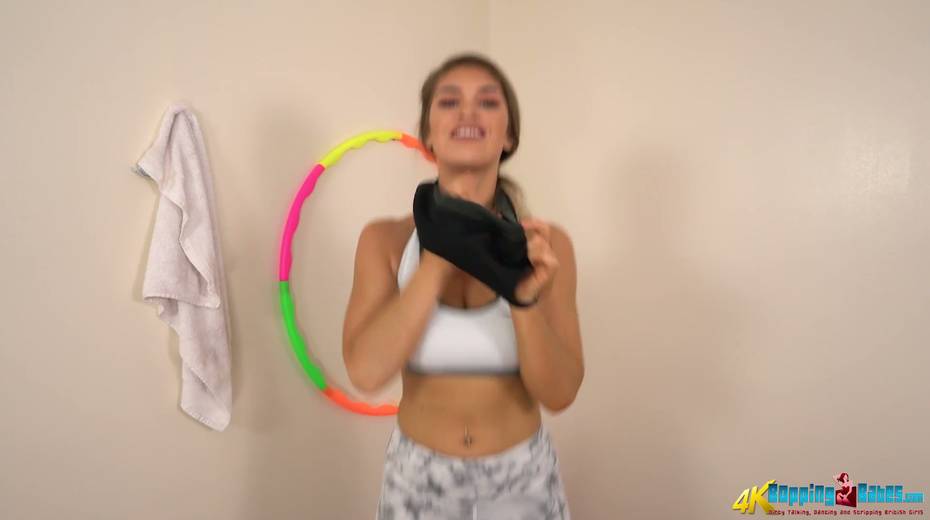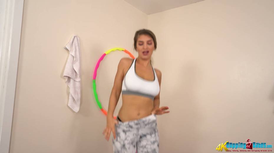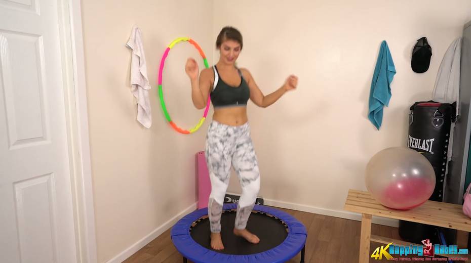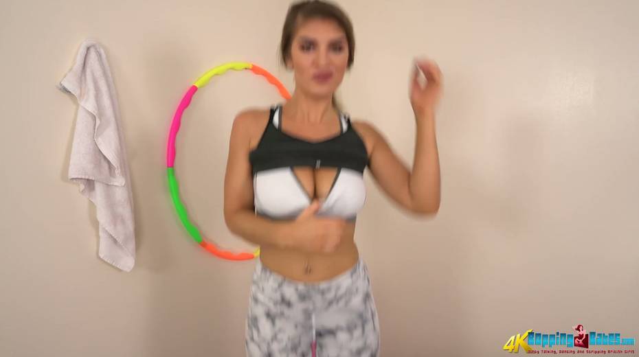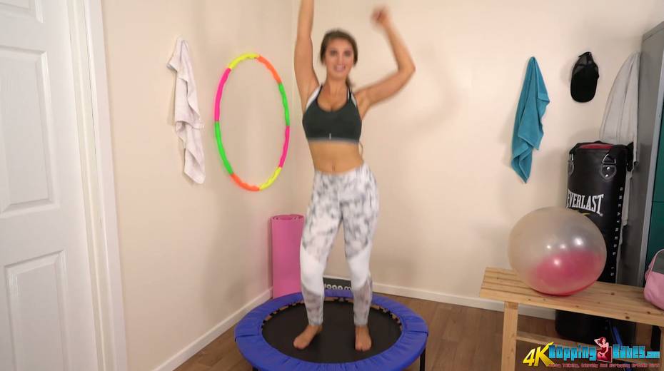 Busty petite gymnast Katie Louise teases with her big bouncing boobies