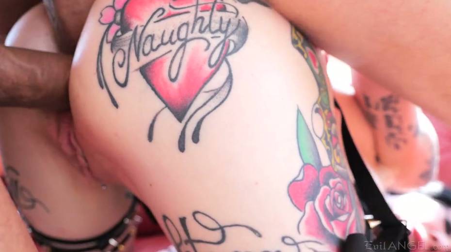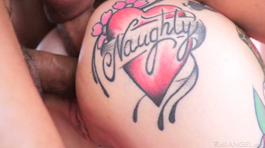 Tattooed big tittied whore Megan Inky takes two big cocks in one hole