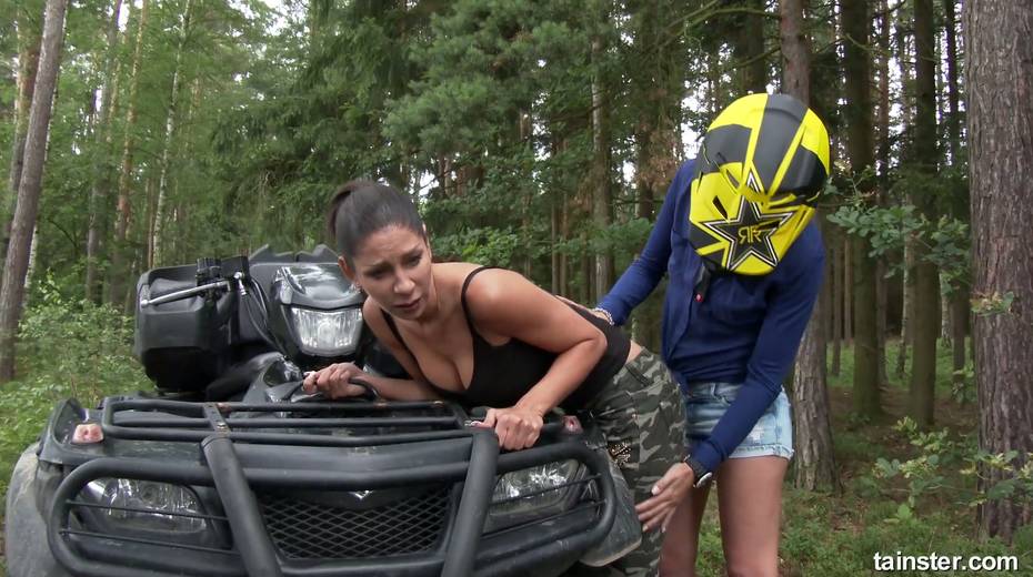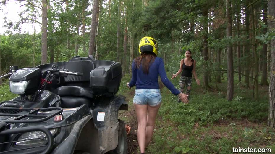 Two voluptuous lesbians are finger fucking each others snatches in the forest