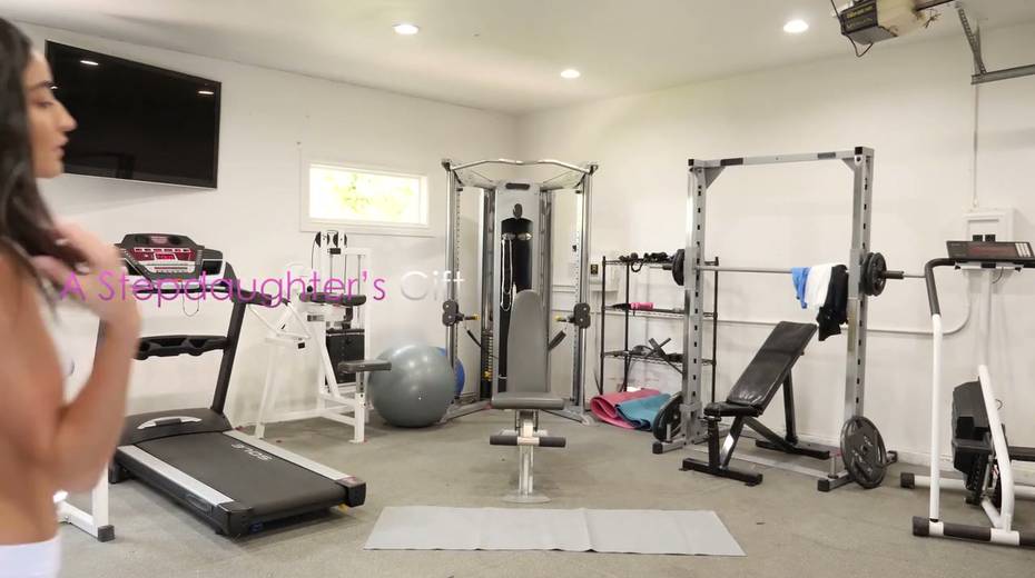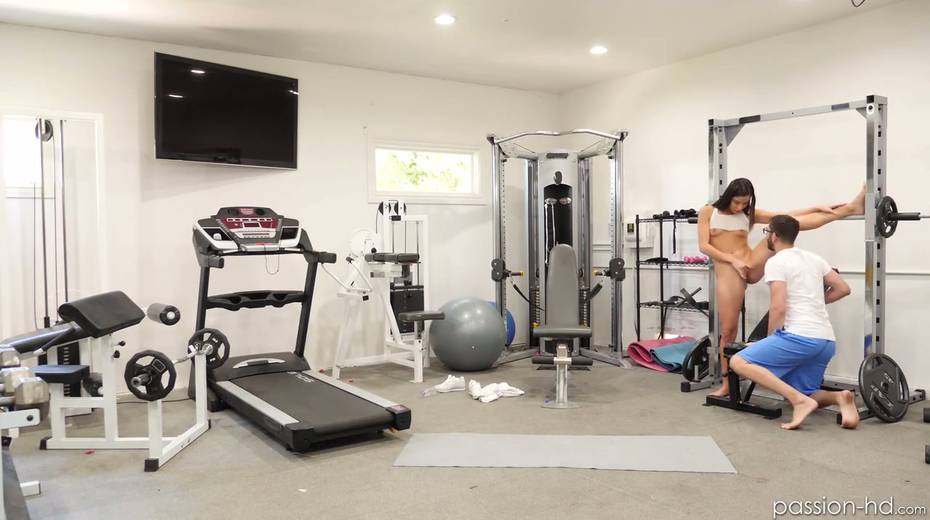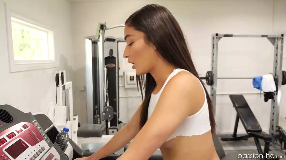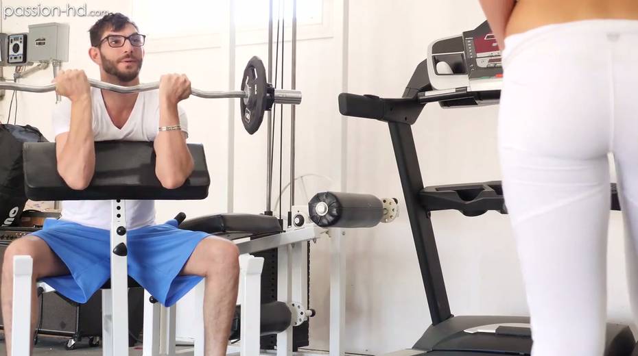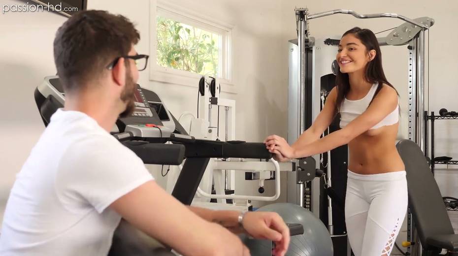 Fitness teen in white wet T-shirt Emily Willis seduces dude and bangs him at the gym