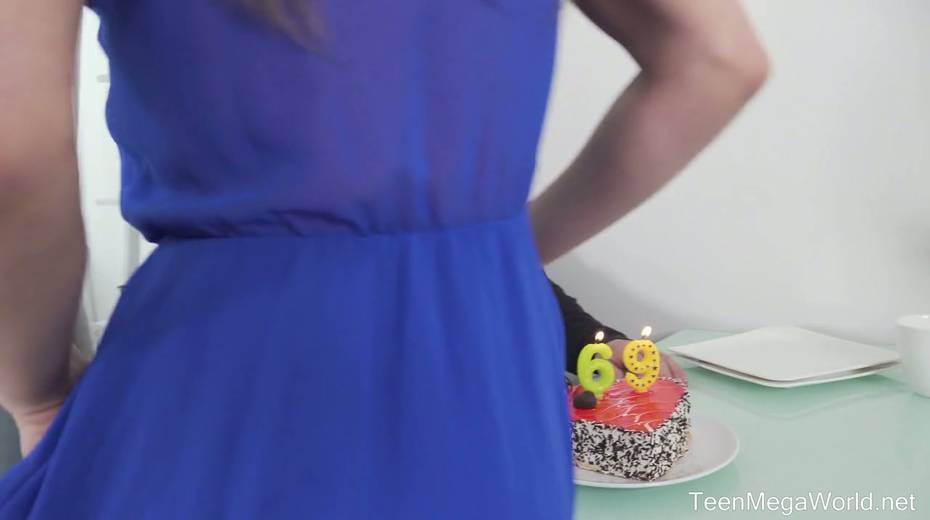 Playful cute teen Sarah Kay is congratulating her old bearded sex partner