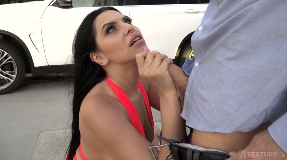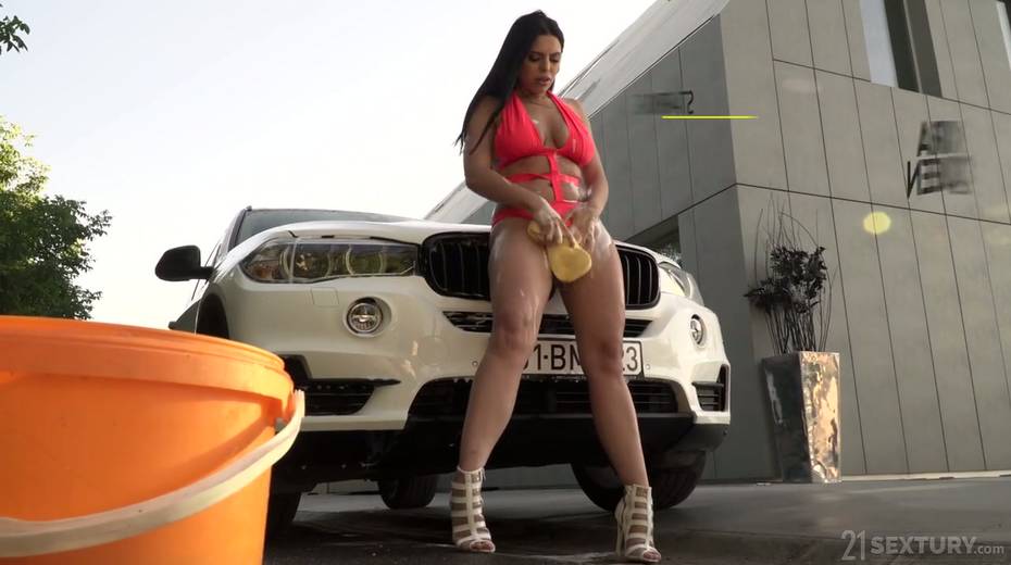 Too hot for car washing Kira Queen gives a goood blowjob and gets her muff nailed and jizzed