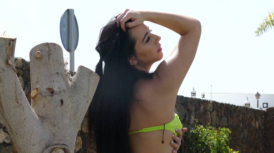 Ample breasted brunette in bikini Kelly W takes off bra and plays with natural boobies