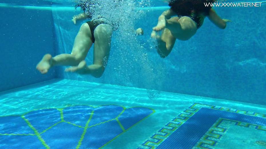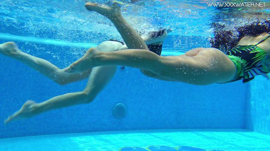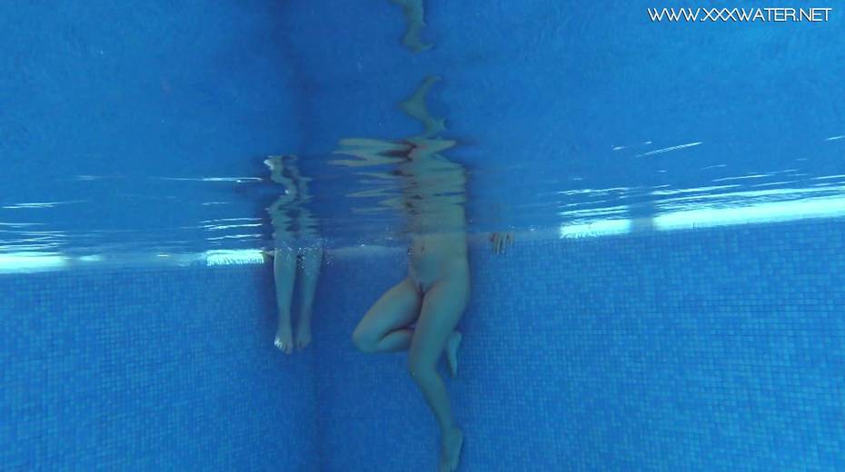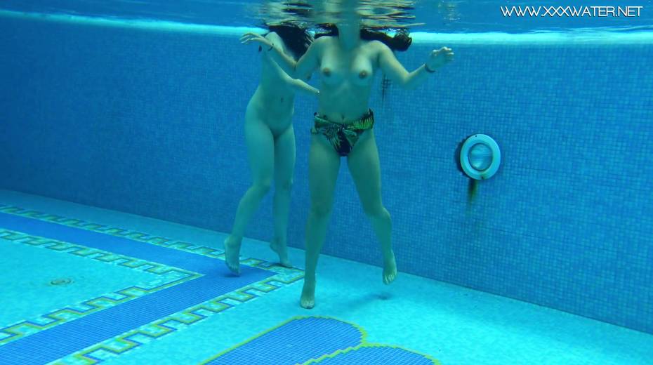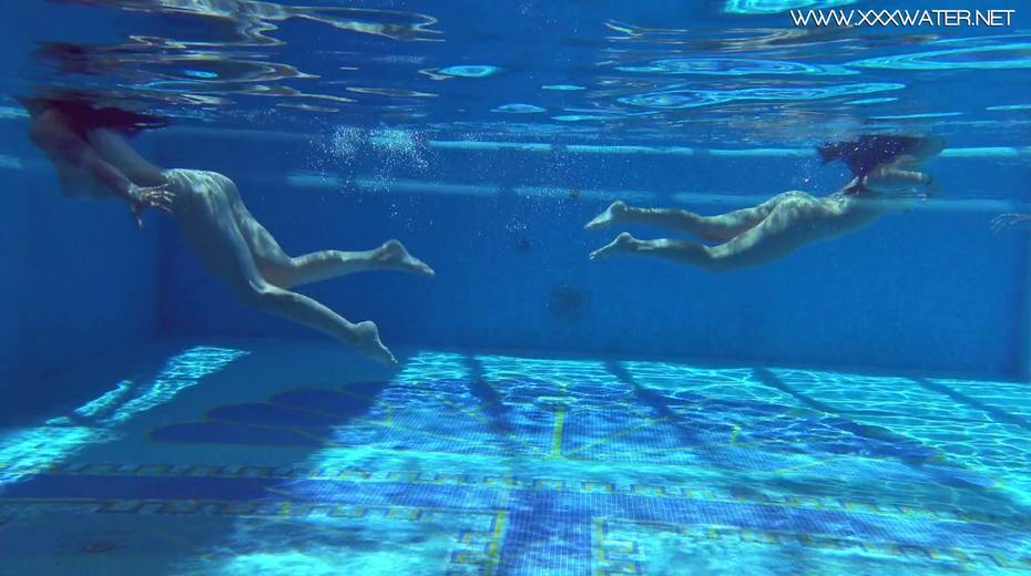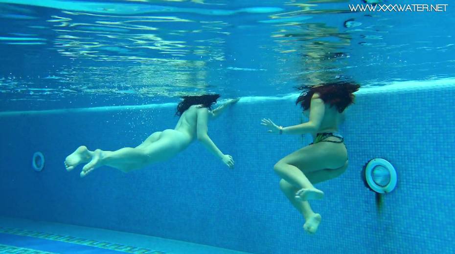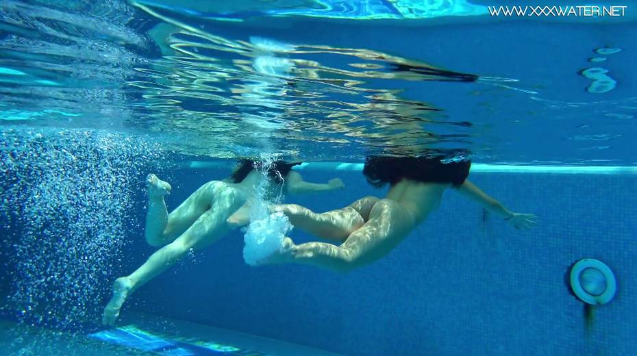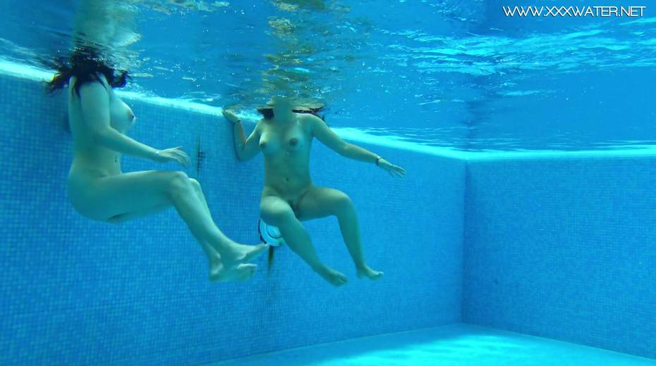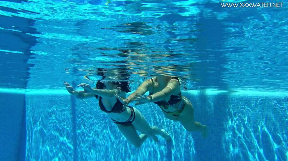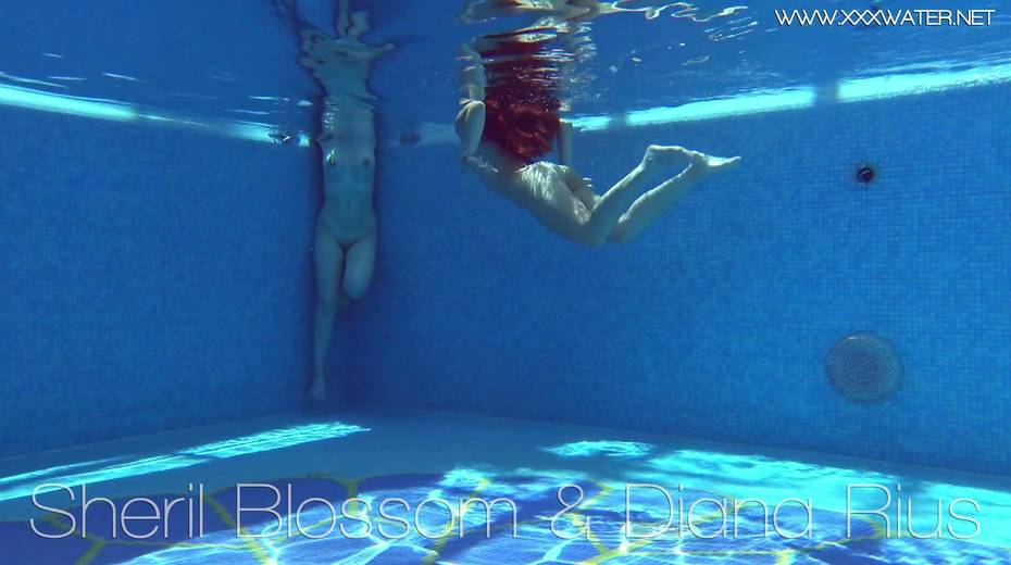 Two topless swimming babes Diana Rius and Sheril Blossom show tricks under the water