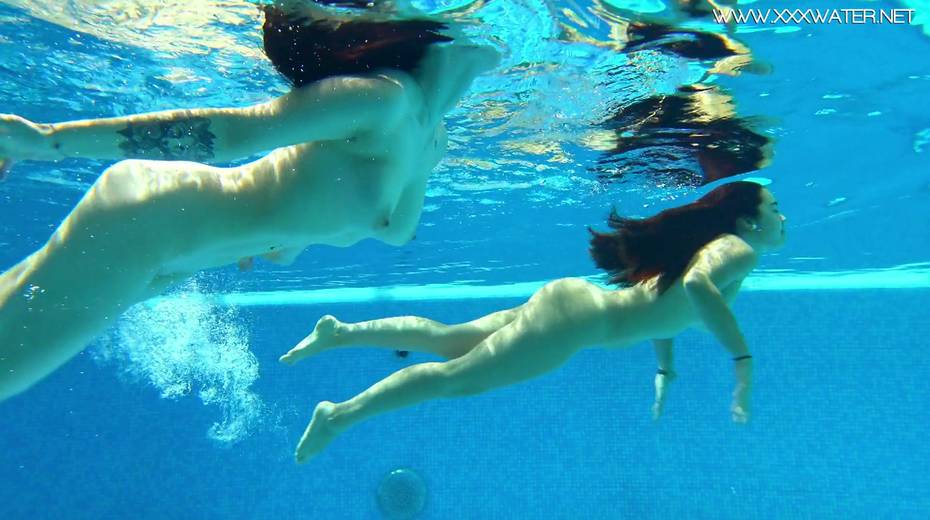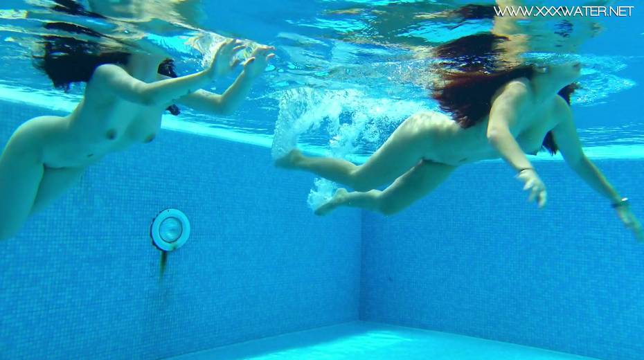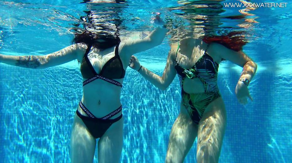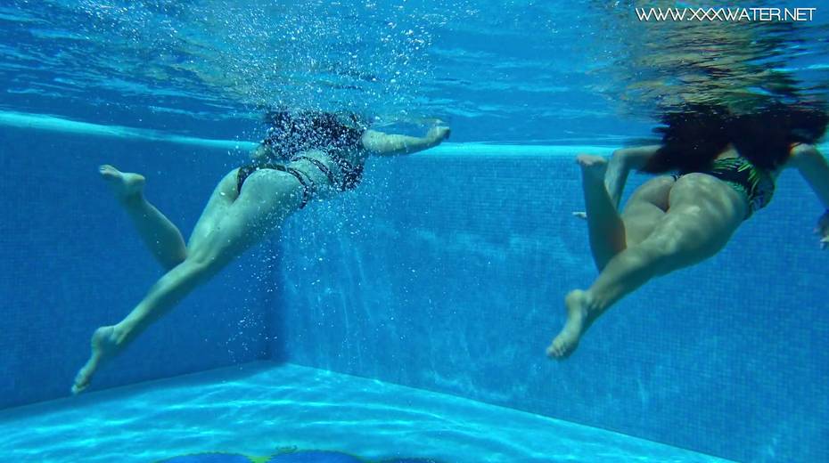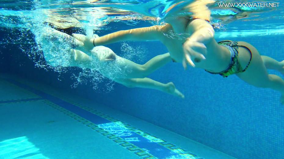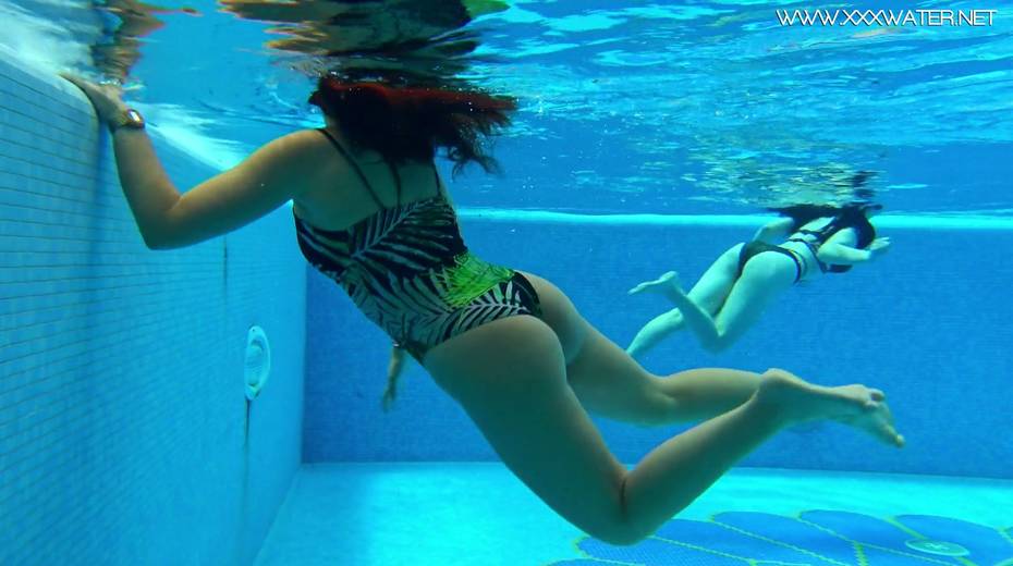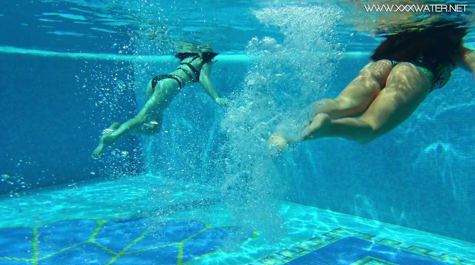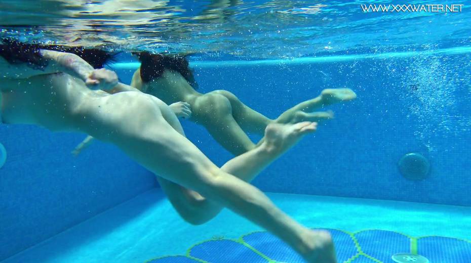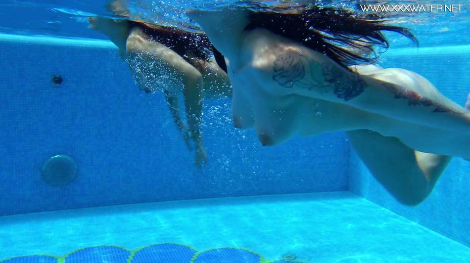 Two topless swimming babes Diana Rius and Sheril Blossom show tricks under the water