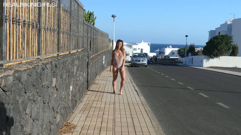 Ample breasted chick Katie Lou walks topless on the sidewalk