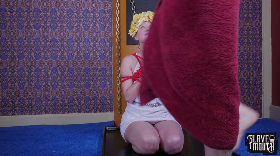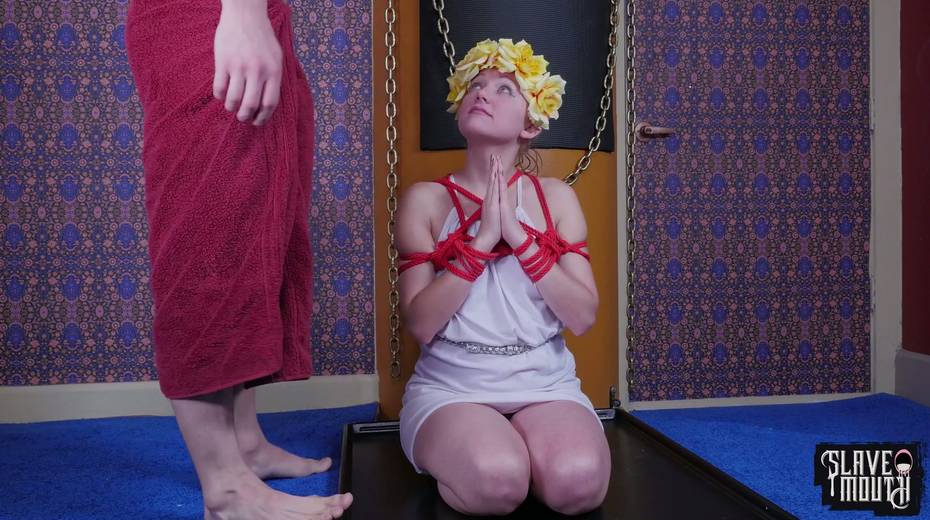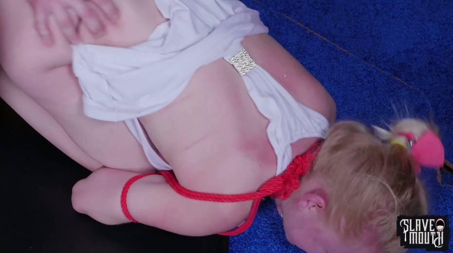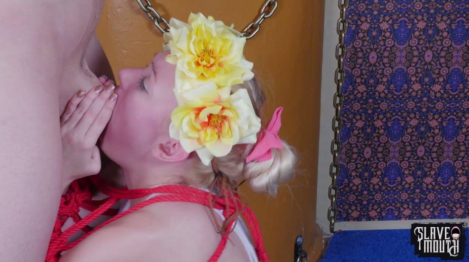 Tied up blond chick Anneliese Snow is face fucked hard before licking dude's anus