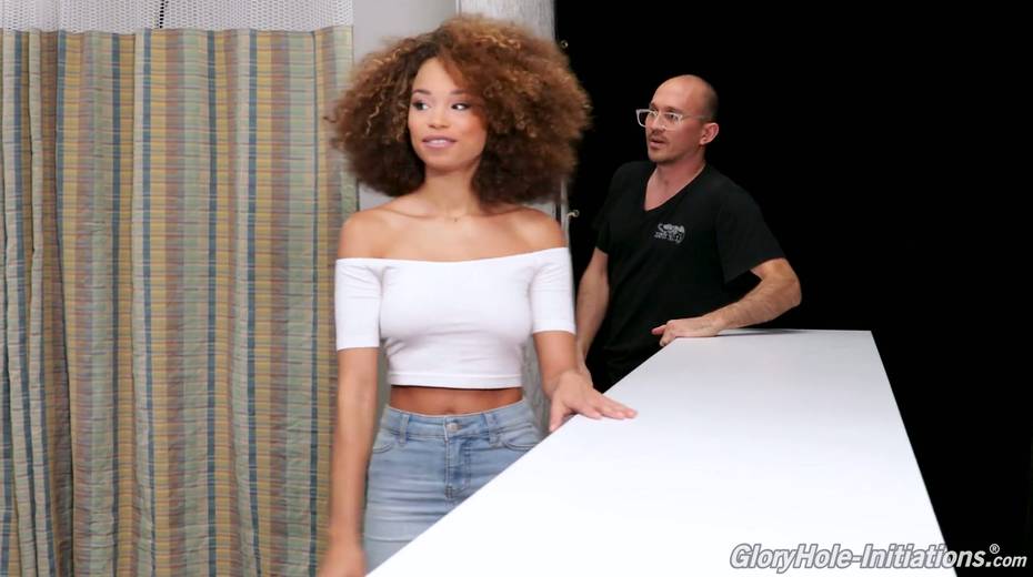 Naughty ebony chick Cecilia Lion is sucking white hose in the glory hole room