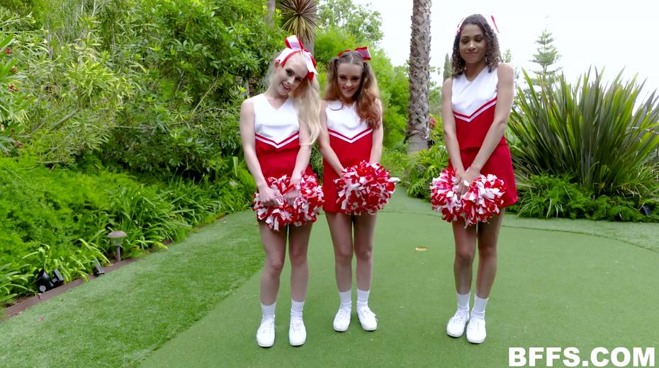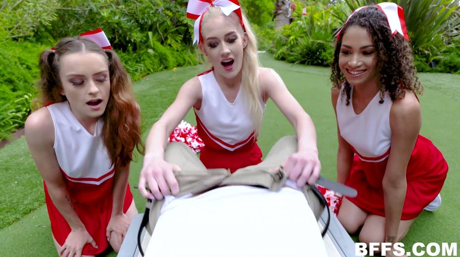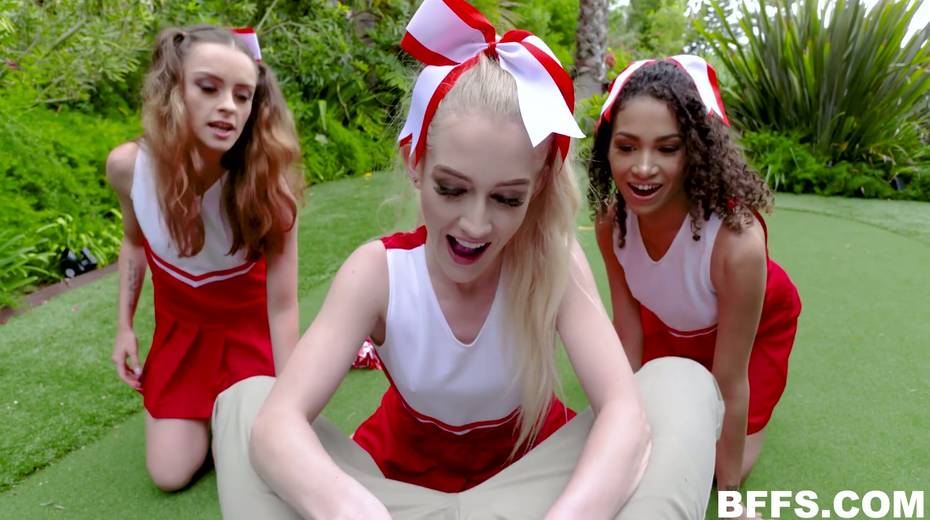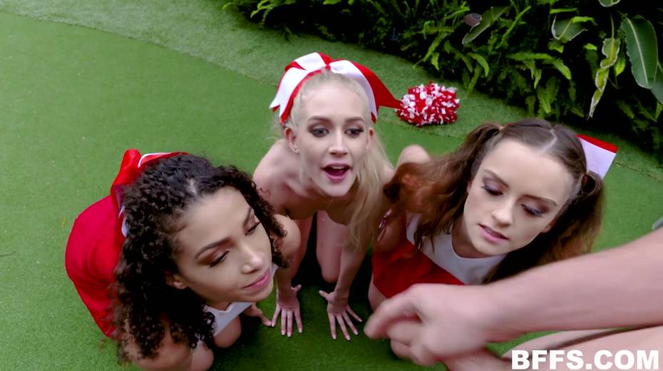 One dude fucks three playful cheerleaders and cum on their pretty faces