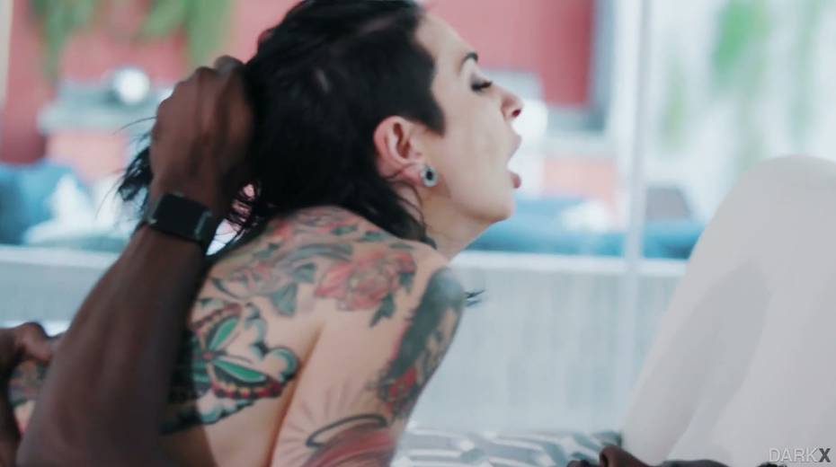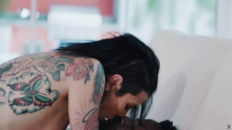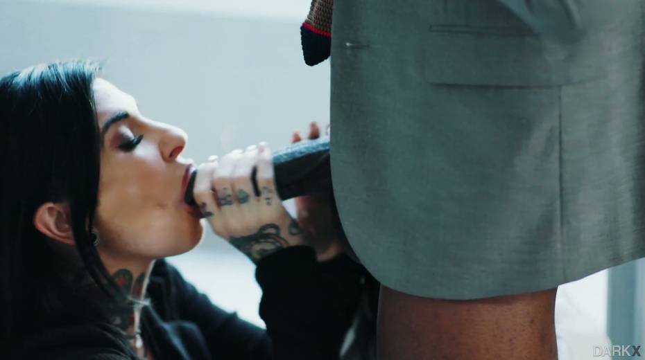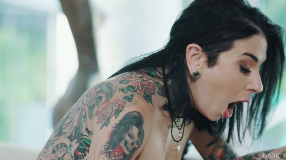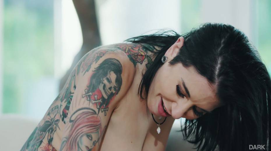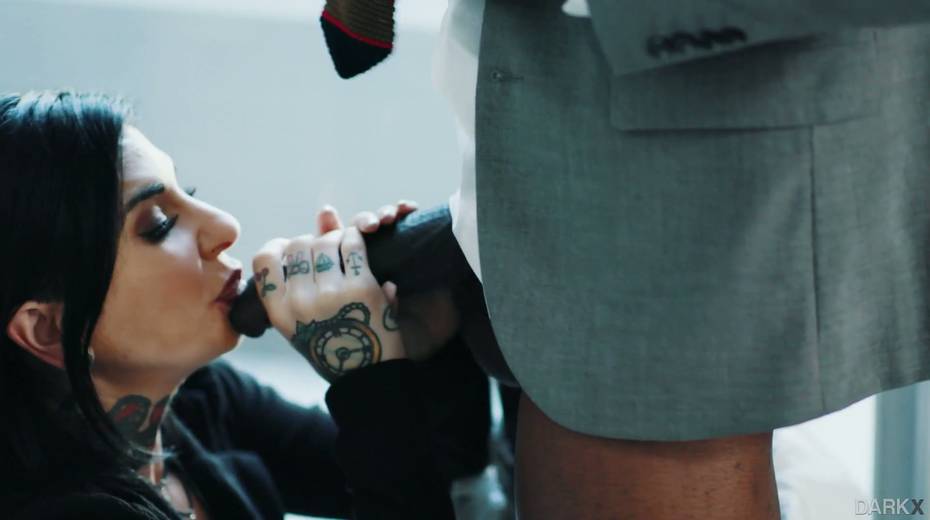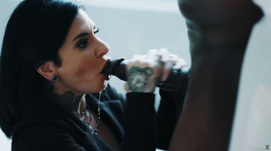 Tattooed white chick Joanna Angel swallows huge black dick before anal sex