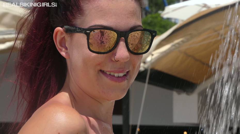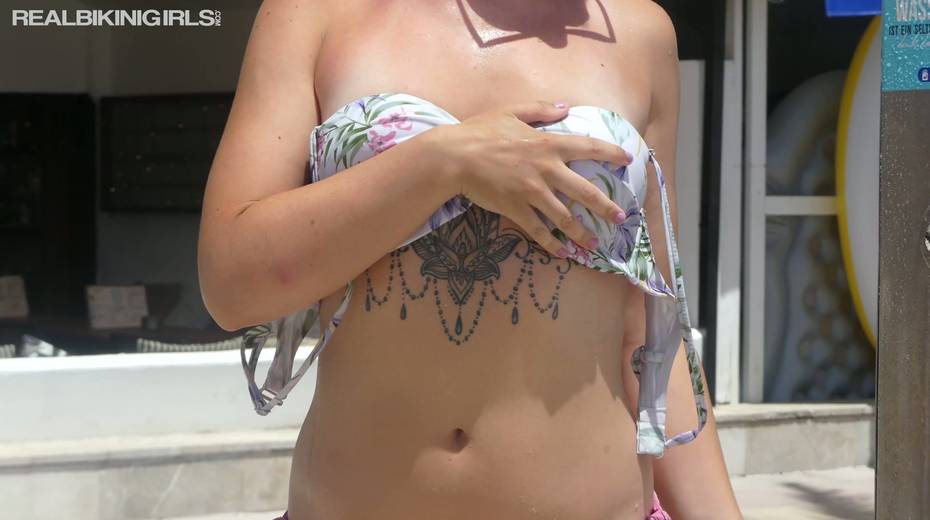 Uninhibited chick Charlotte P takes off bikini top and shows tits in public