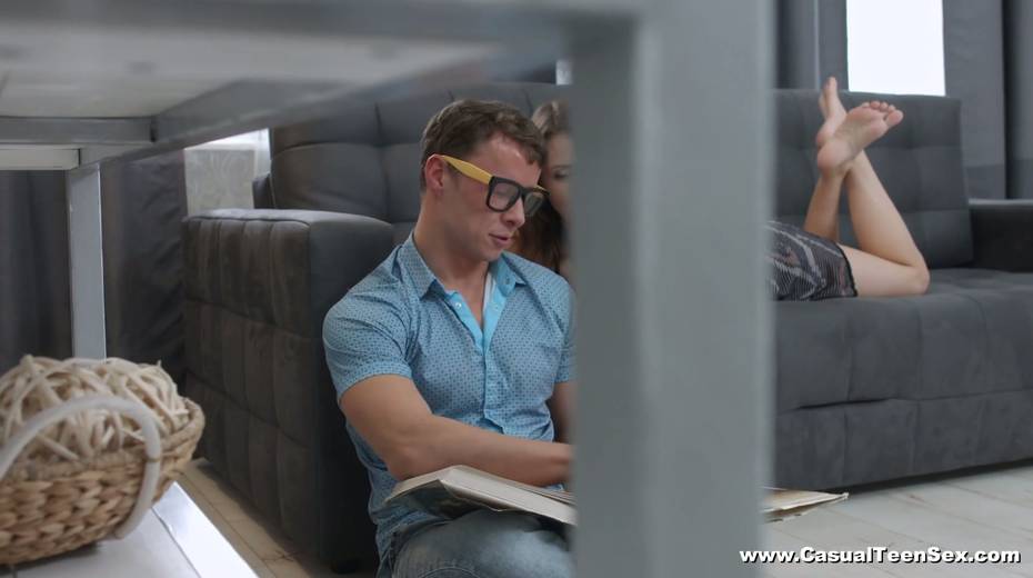 Cute auburn teen Sofy Torn is making love with timid college fellow