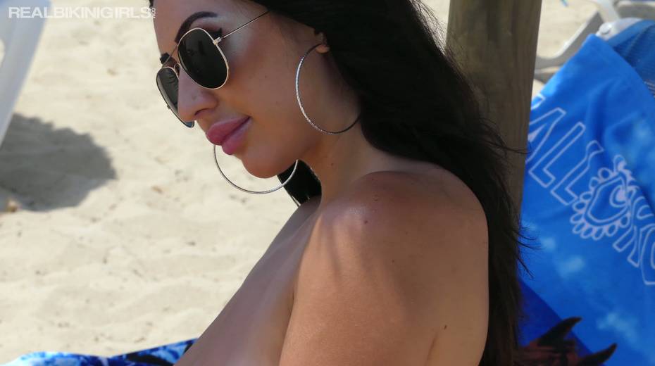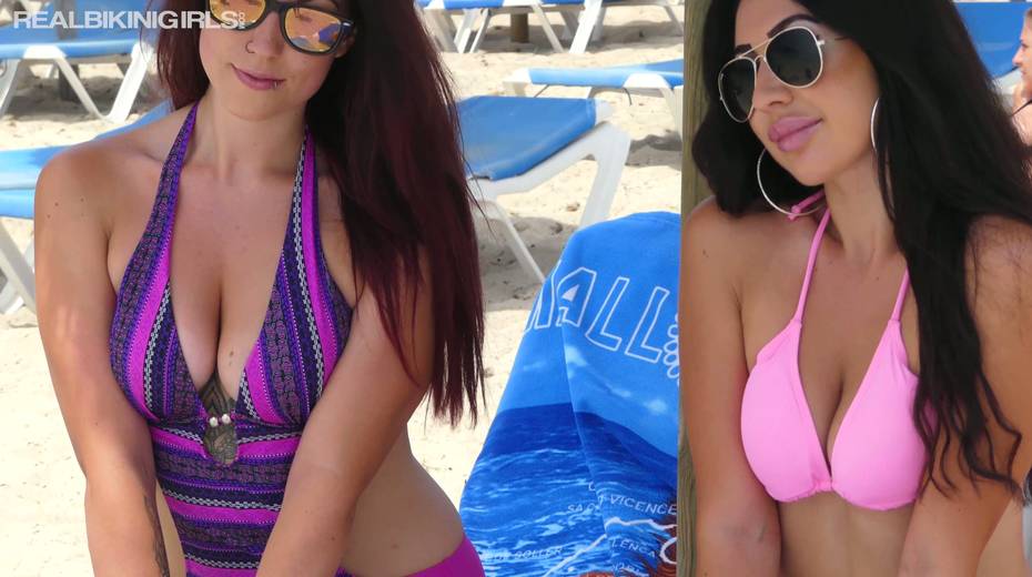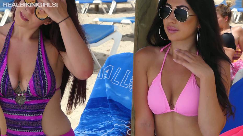 Two sex-appeal busty bikini girls are sunbathing topless in public
