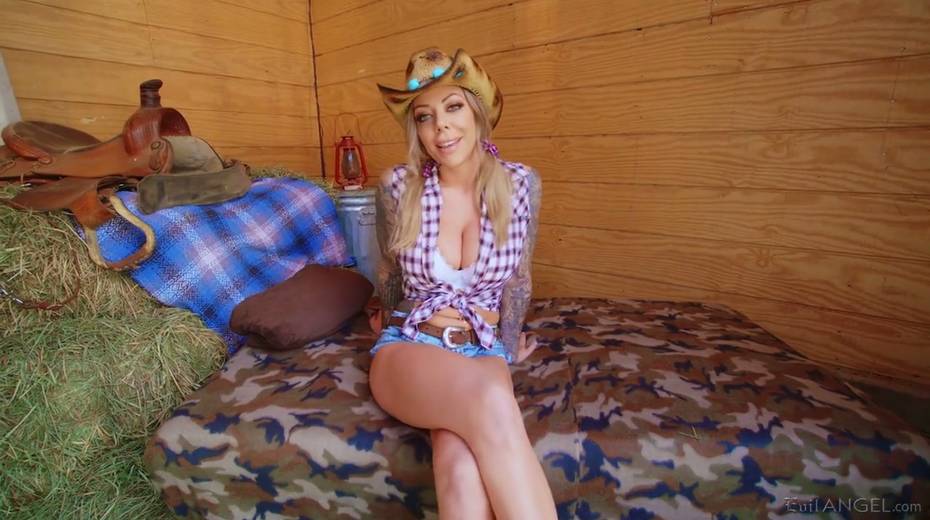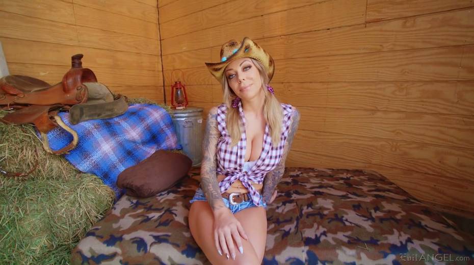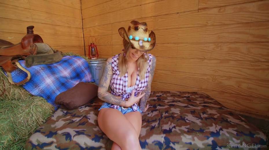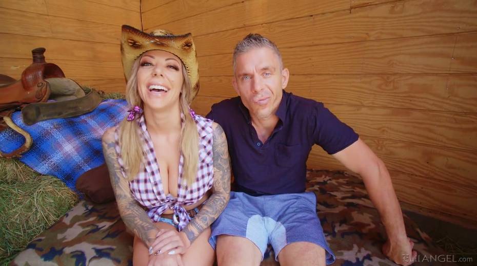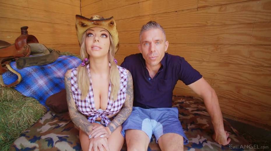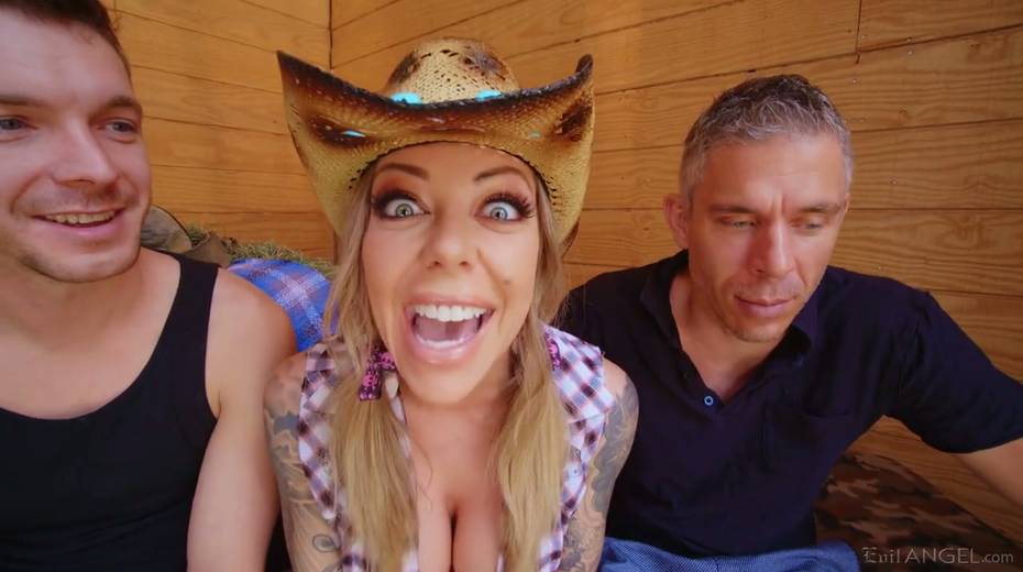 Mega busty bitch Karma Rx give an interview before FMM scene