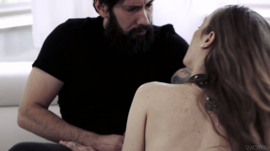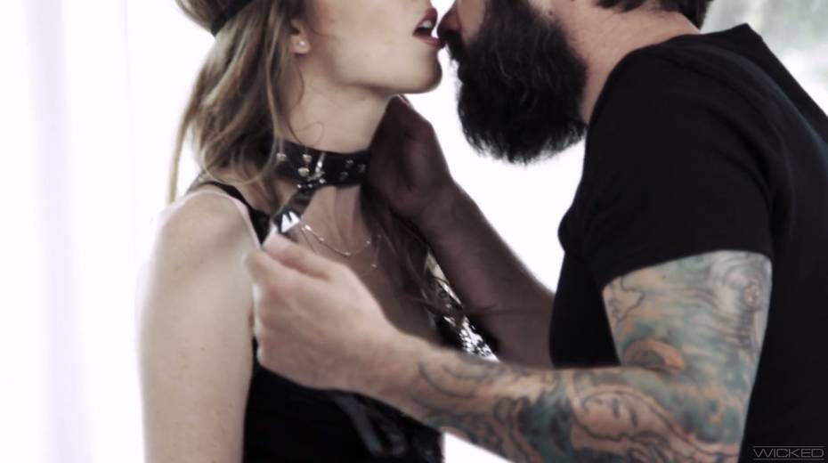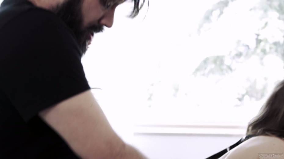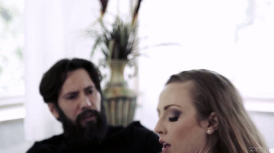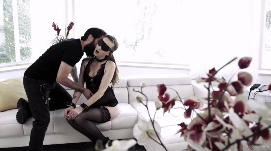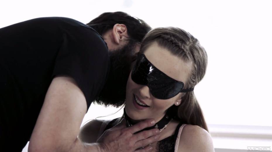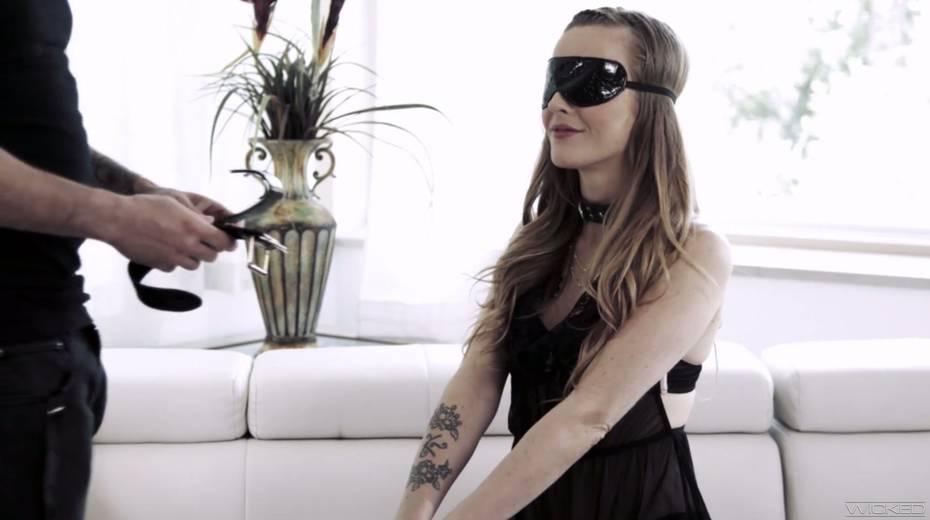 Blind folded brunette Karla Kush gives a blowjob and gets her slit rammed
