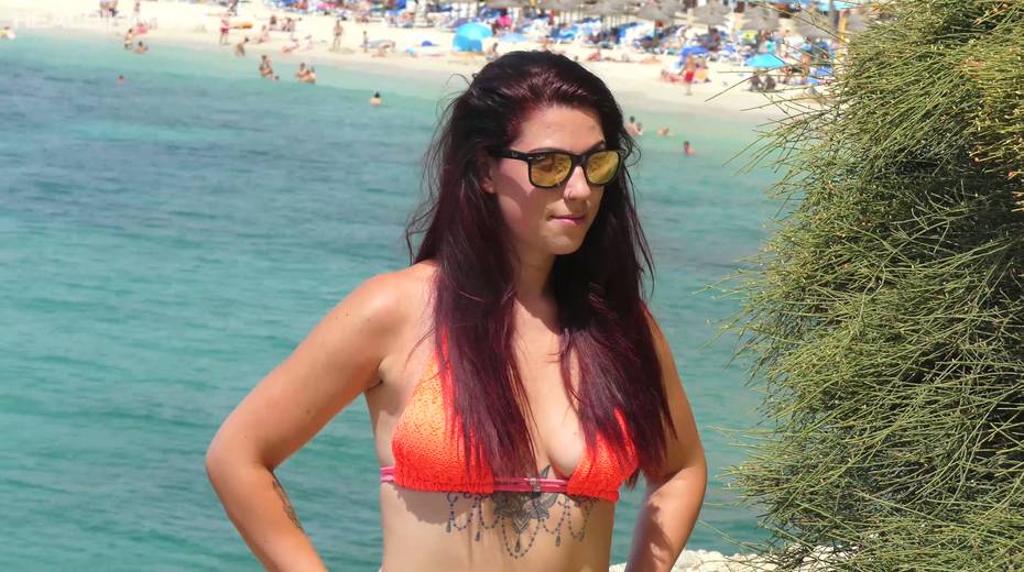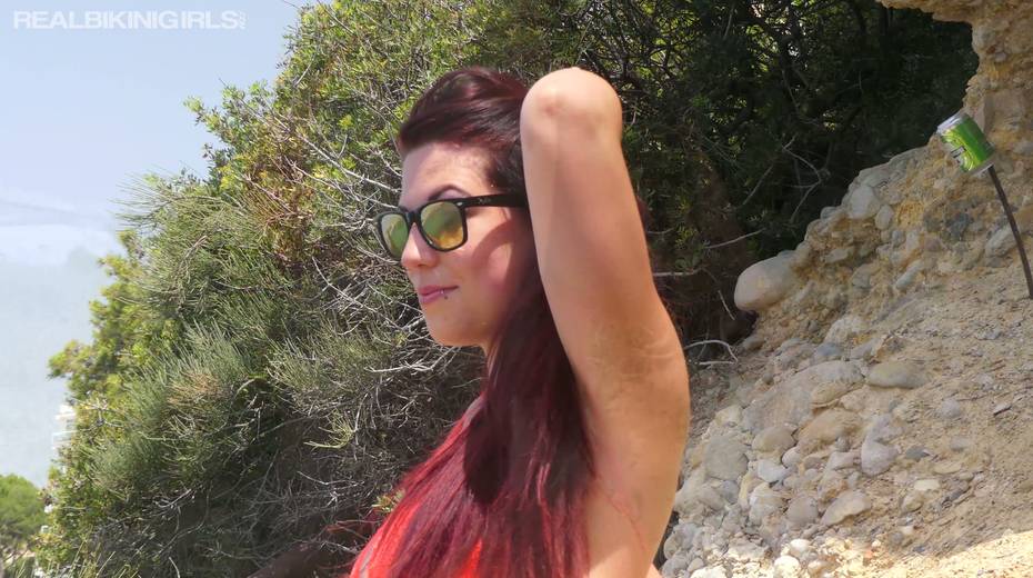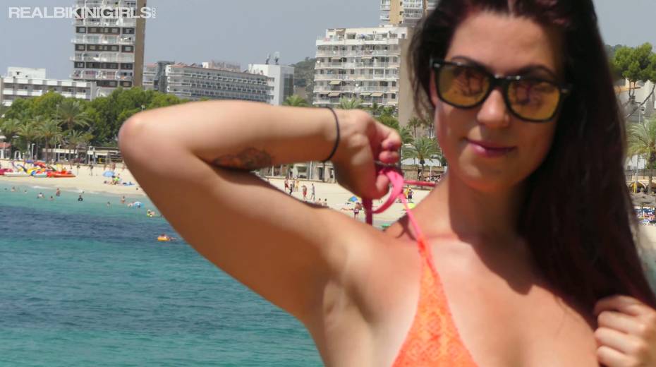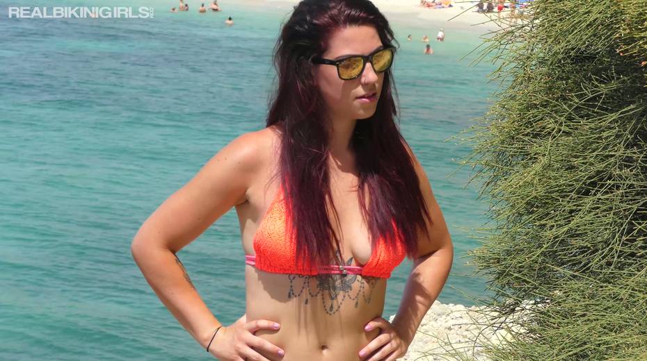 Slutty chick in bikini Charlotte P is flashing saggy small tits
