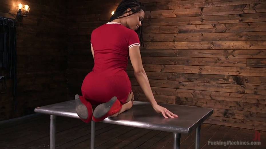 Leggy ebony pornstart Kira Noir is testing new fucking machine