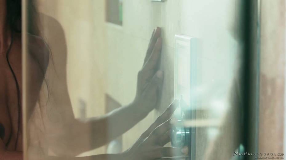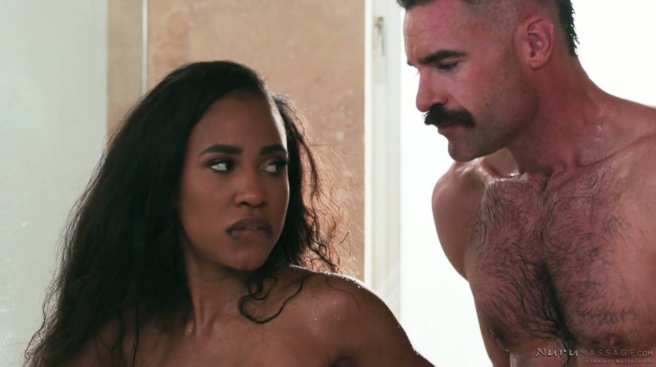 Ebony masseuse Demi Sutra gives a blowjob and nuru massage after taking a shower