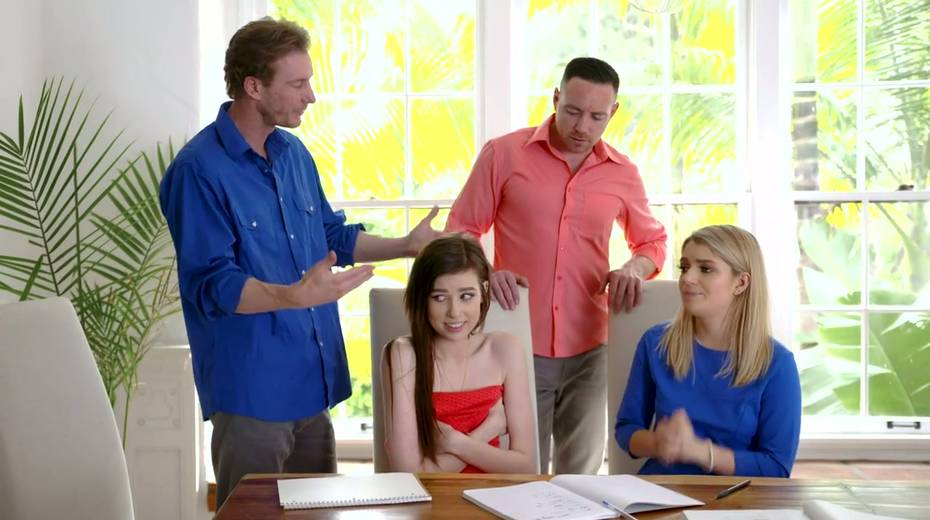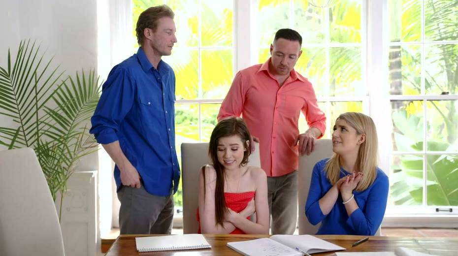 Two naughty college girlfriends swap step daddies for crazy foursome sex