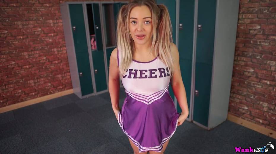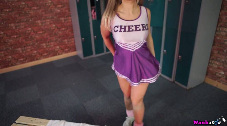 Pigtailed cheerleader Beth gives a blowjob and takes cumshots on body