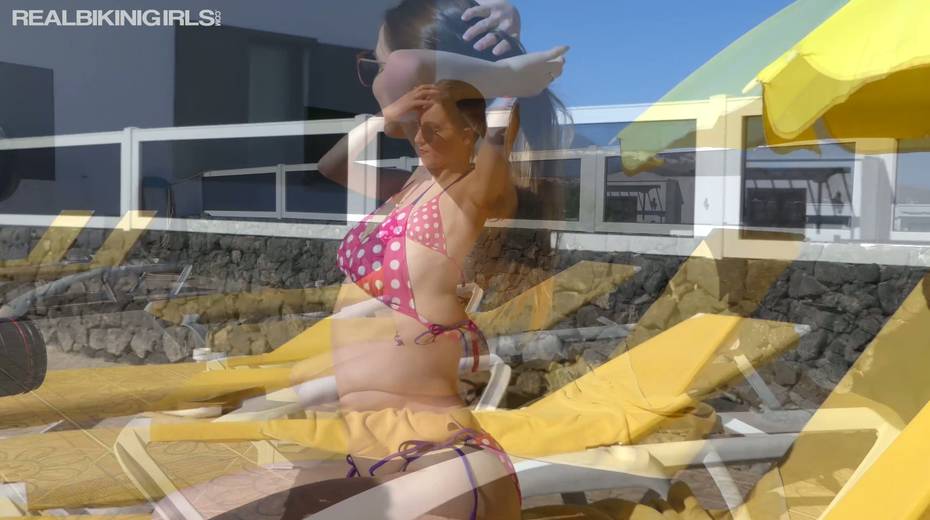 Sexy brunette in bikini Scarlot Rose is sunbathing topless