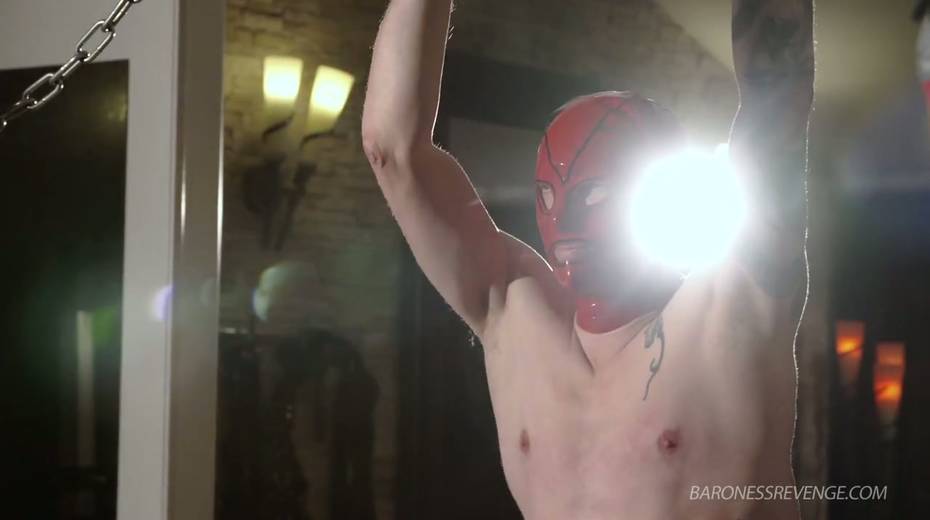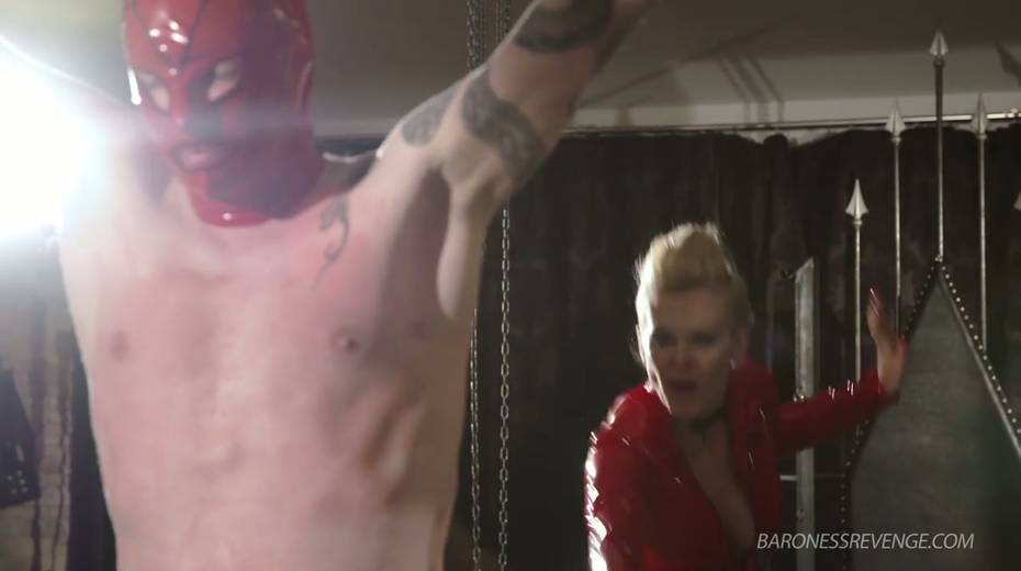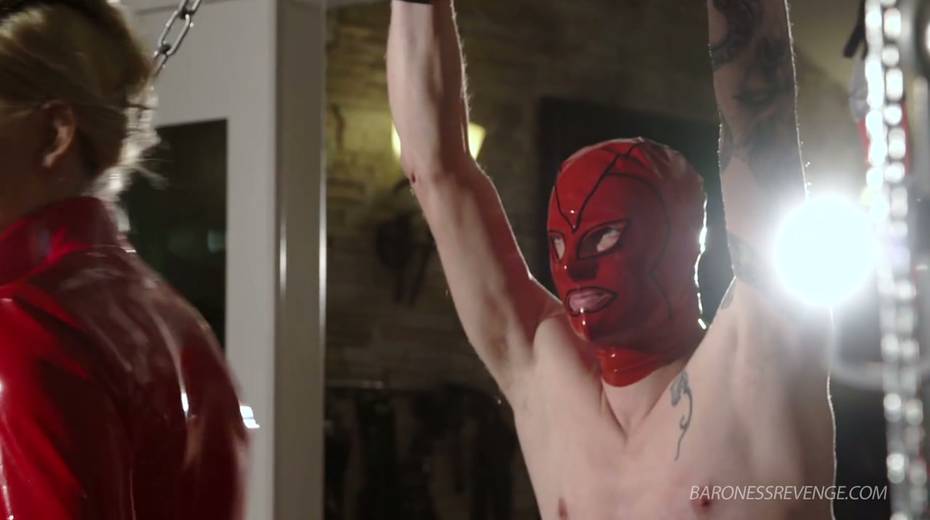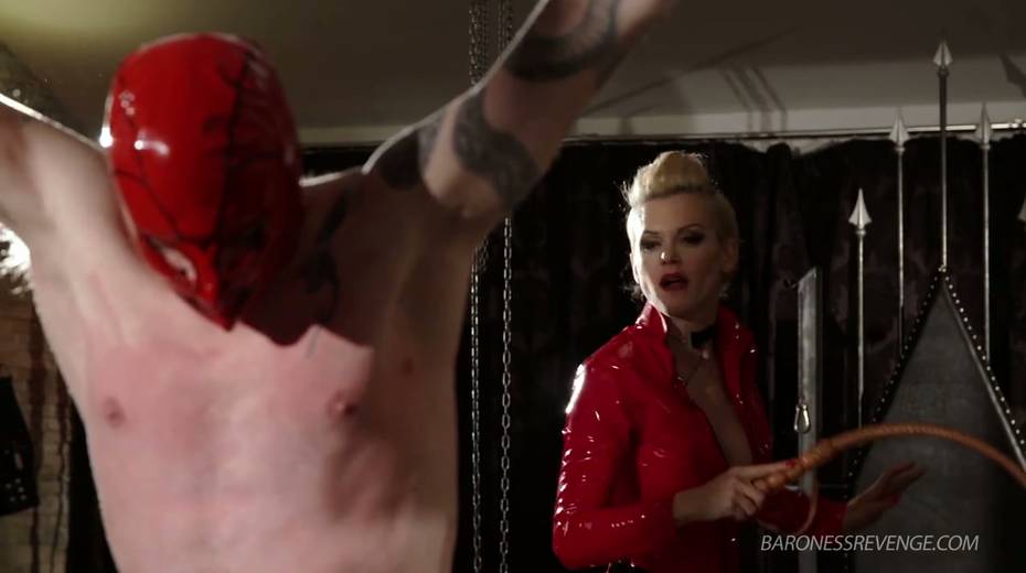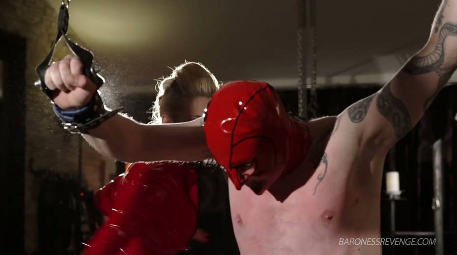 Sexy domina in red latex outfit Baroness Davina Dust makes submissive lick sweaty pussy