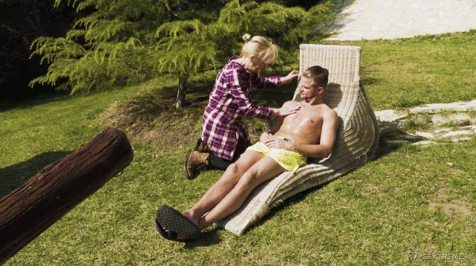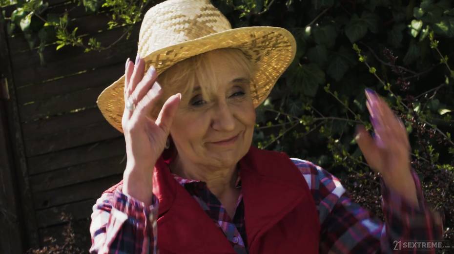 Sexually charged granny Nanney gives a blowjob to young dude in the garden