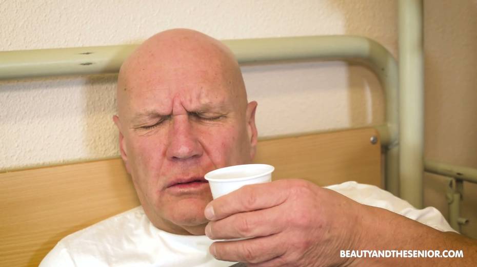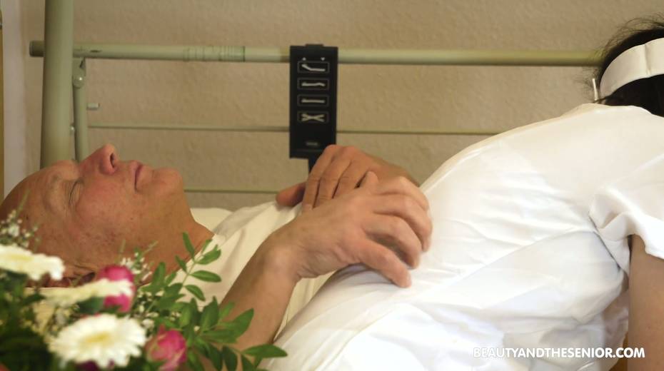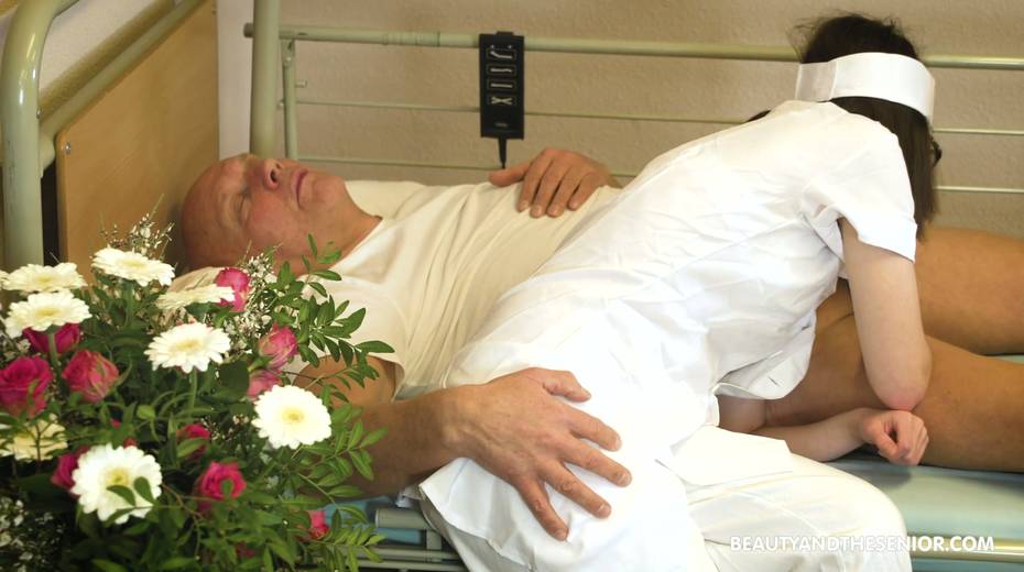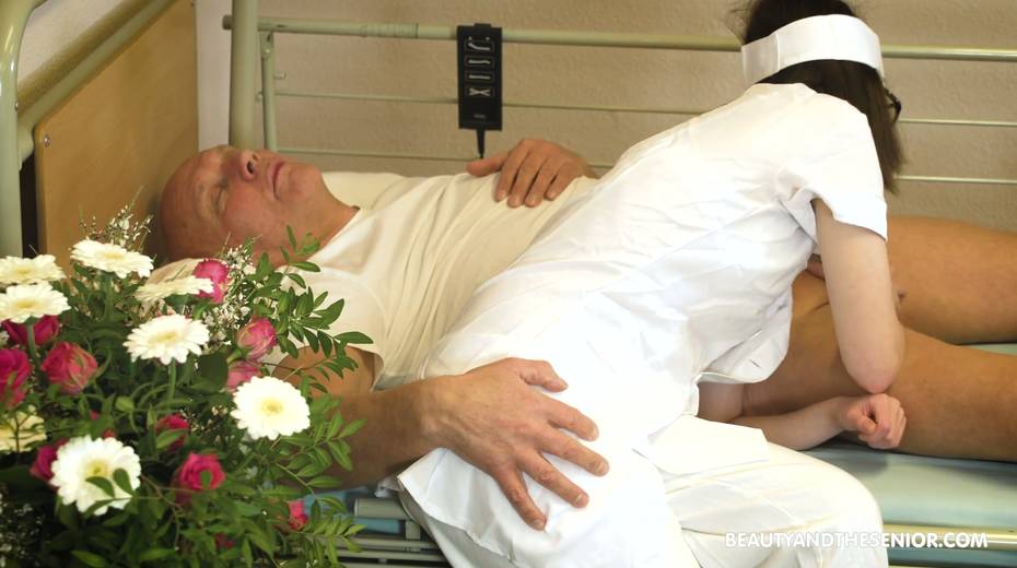 Cum-thirsty young nurse Sara Bell gives a blowjob to old patient