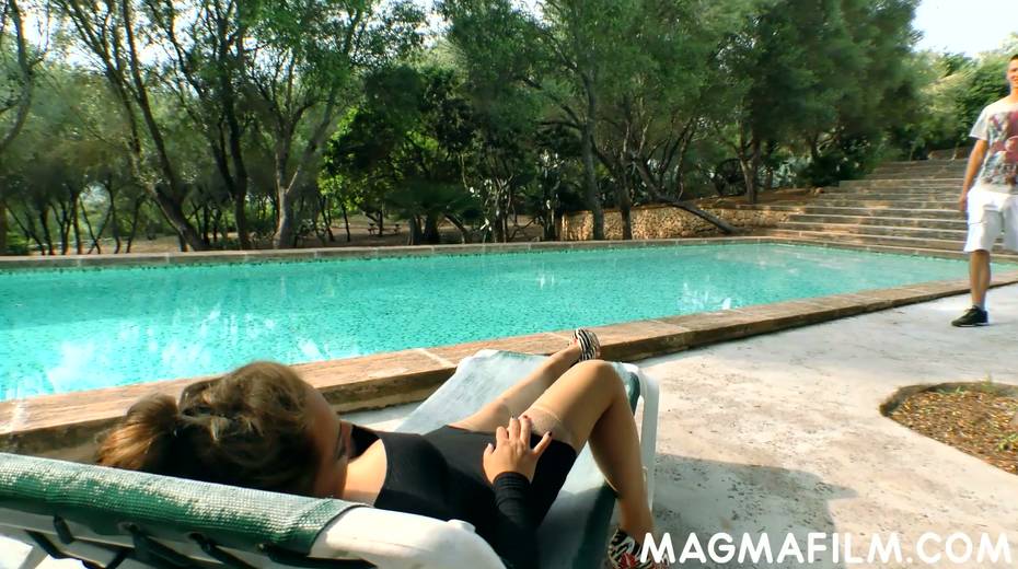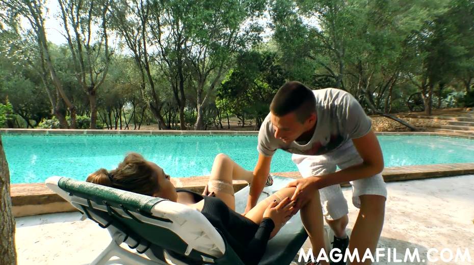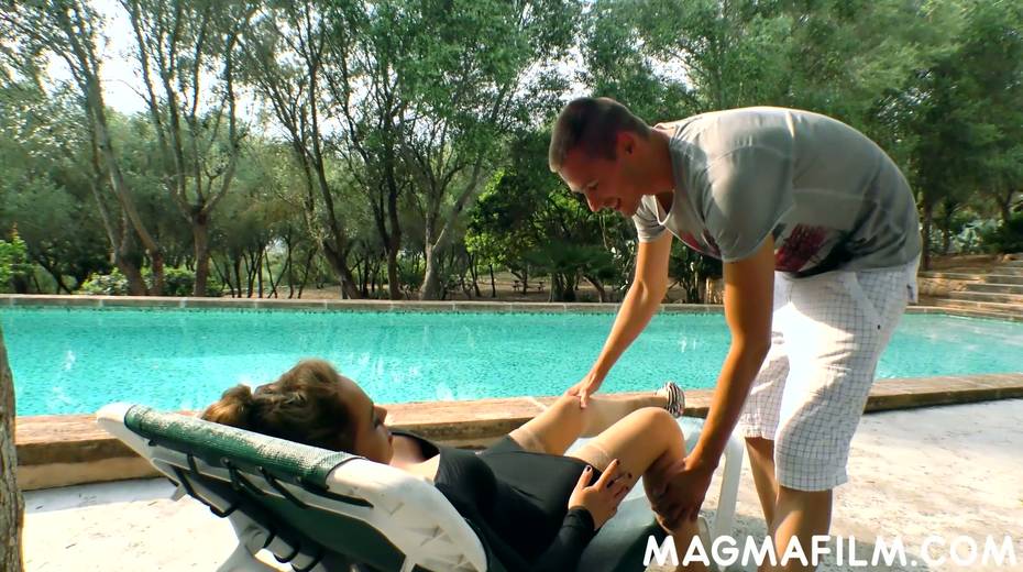 Young womanizer gives a cunnilingus and fucks elder woman by the pooside