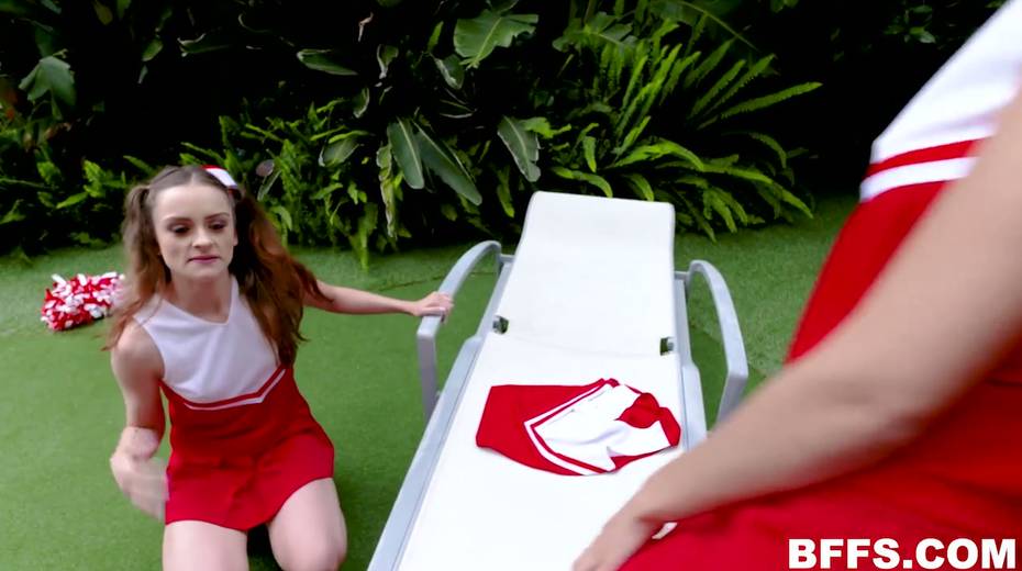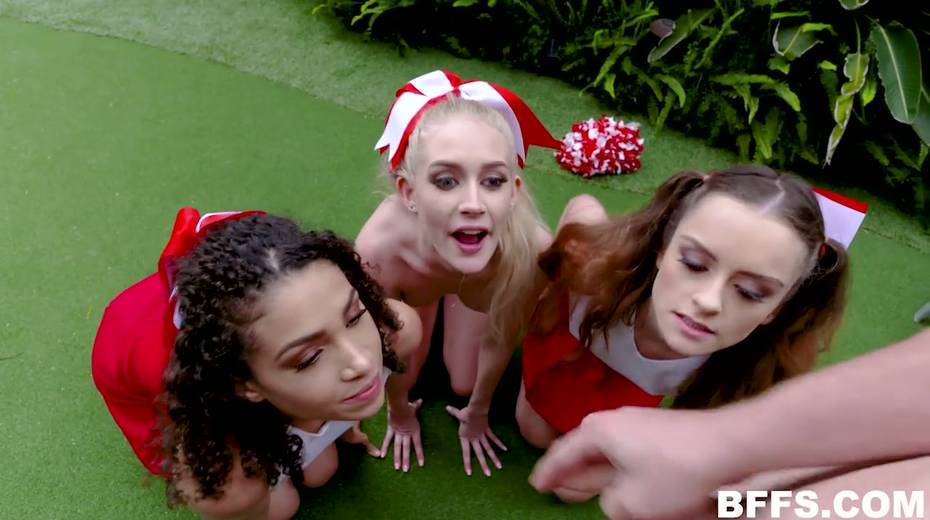 Three cum-thirsty cheerleaders give a blowjob and get fucked in hot POV scene