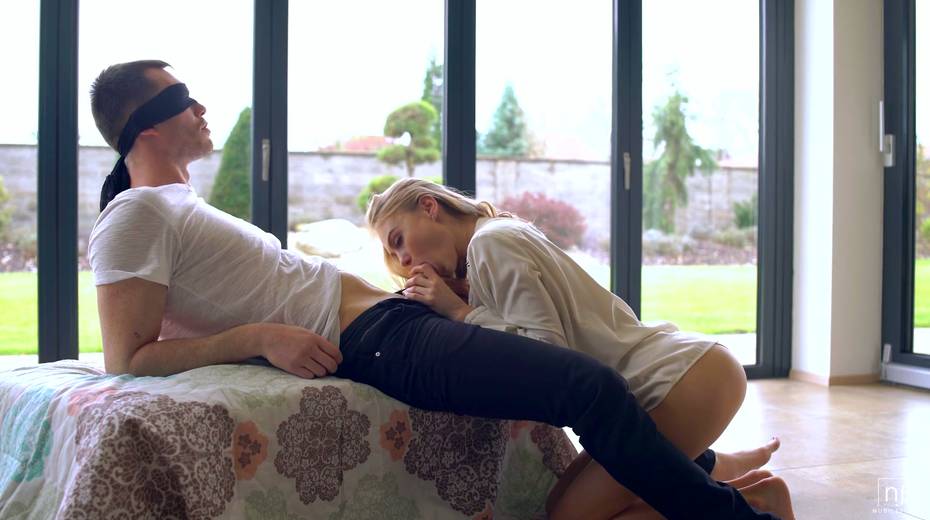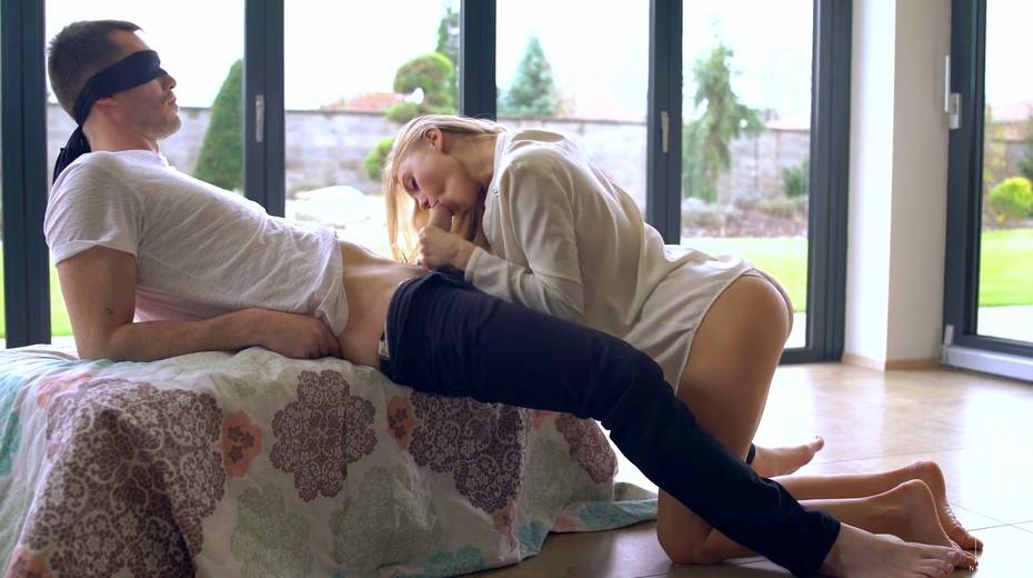 Sweet looking babe Nancy A gives a wonderful blowjob to her blind folded boyfriend