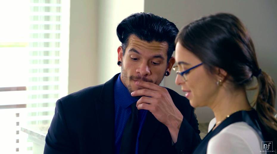 Nerdy brunette in glasses Riley Reid is fucked and jizzed by one horny dude